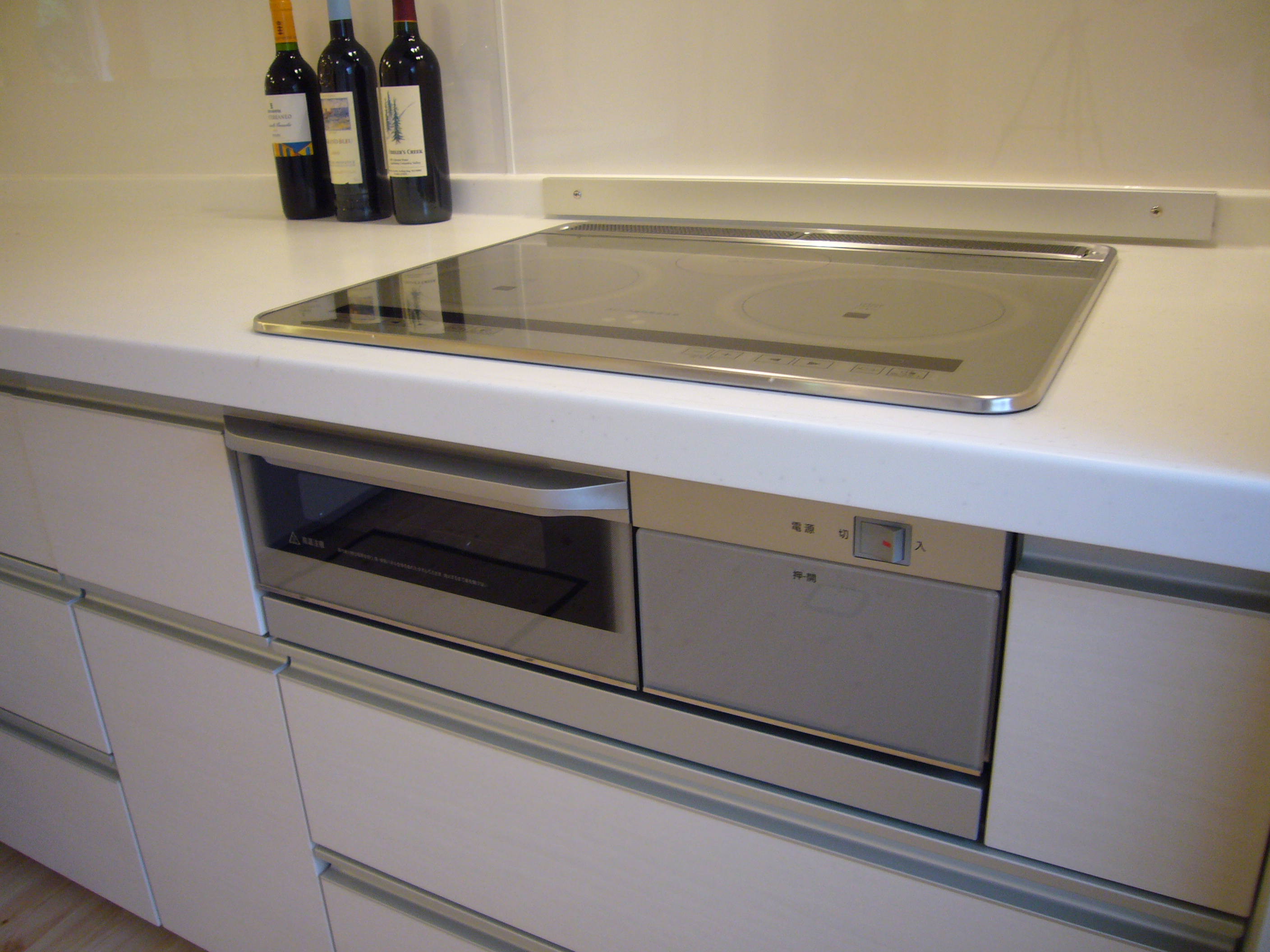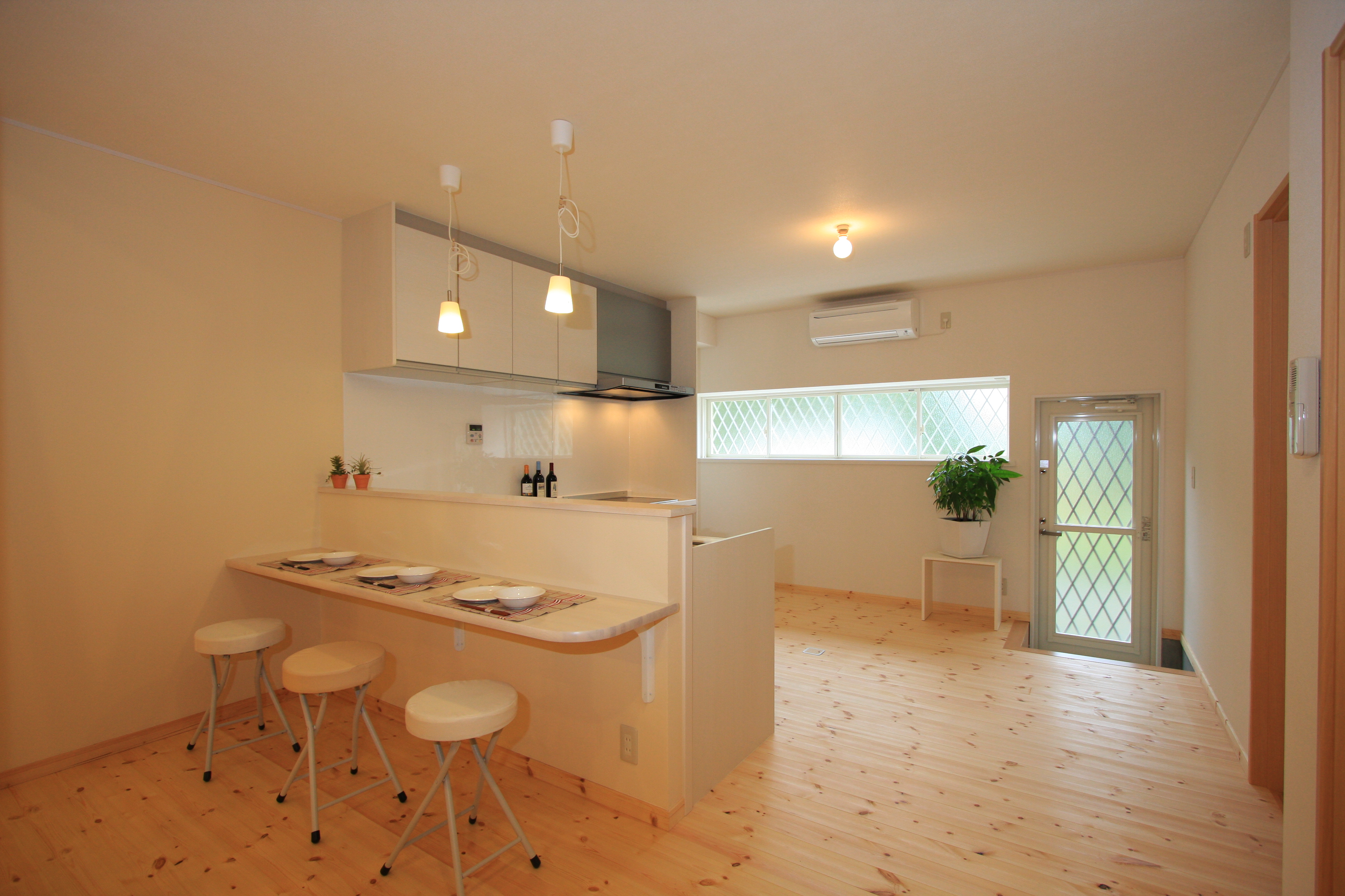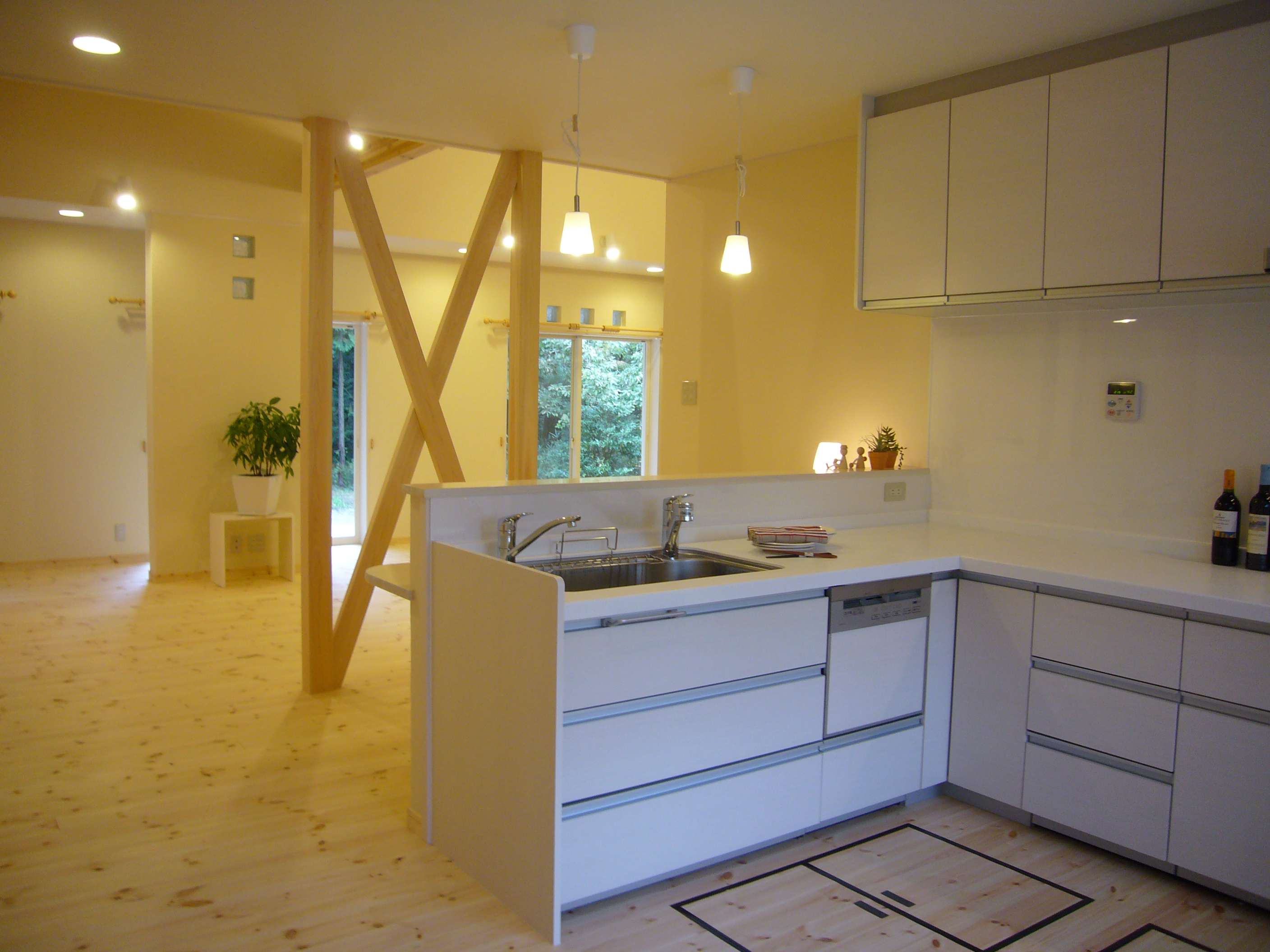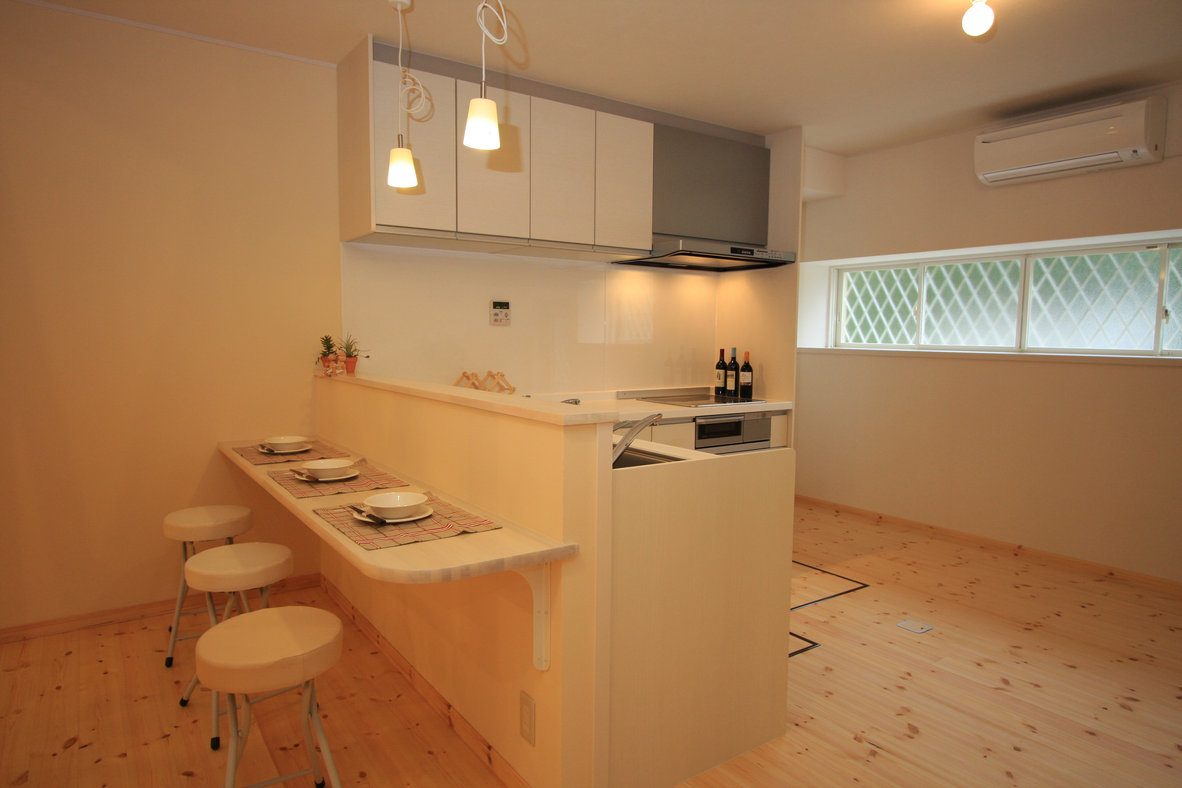 造作壁のカウンターを作り、L型のシステムキッチンで対面キッチンにした。
