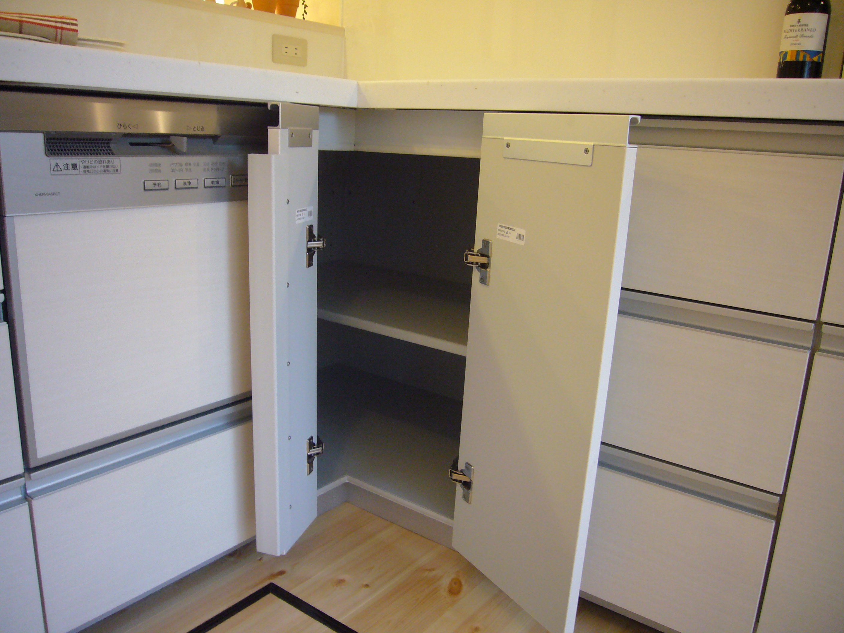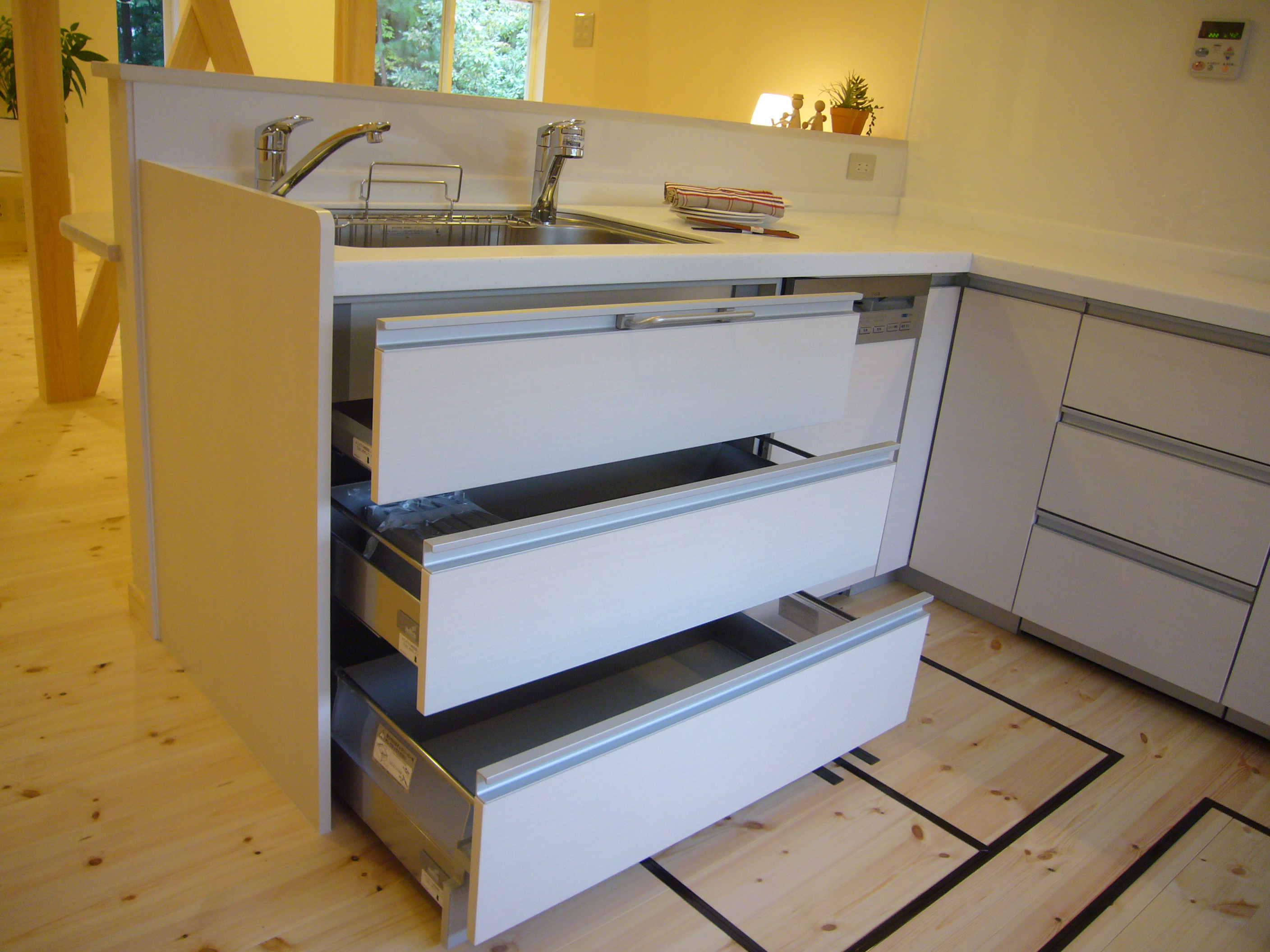 スペースを大きく使うため、リビング側にシンクが向くL型のシステムキッチンを採用。