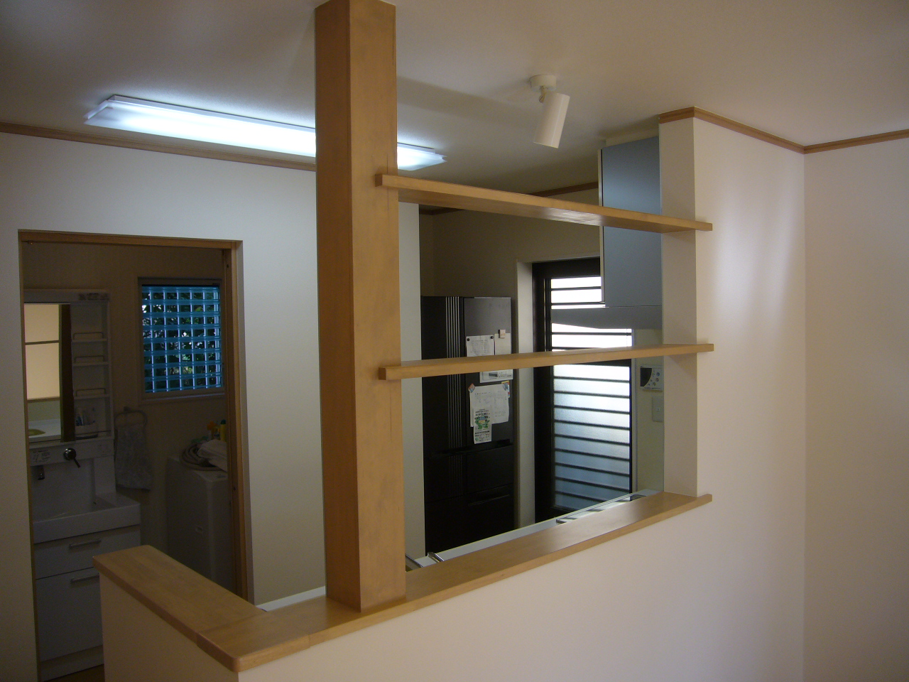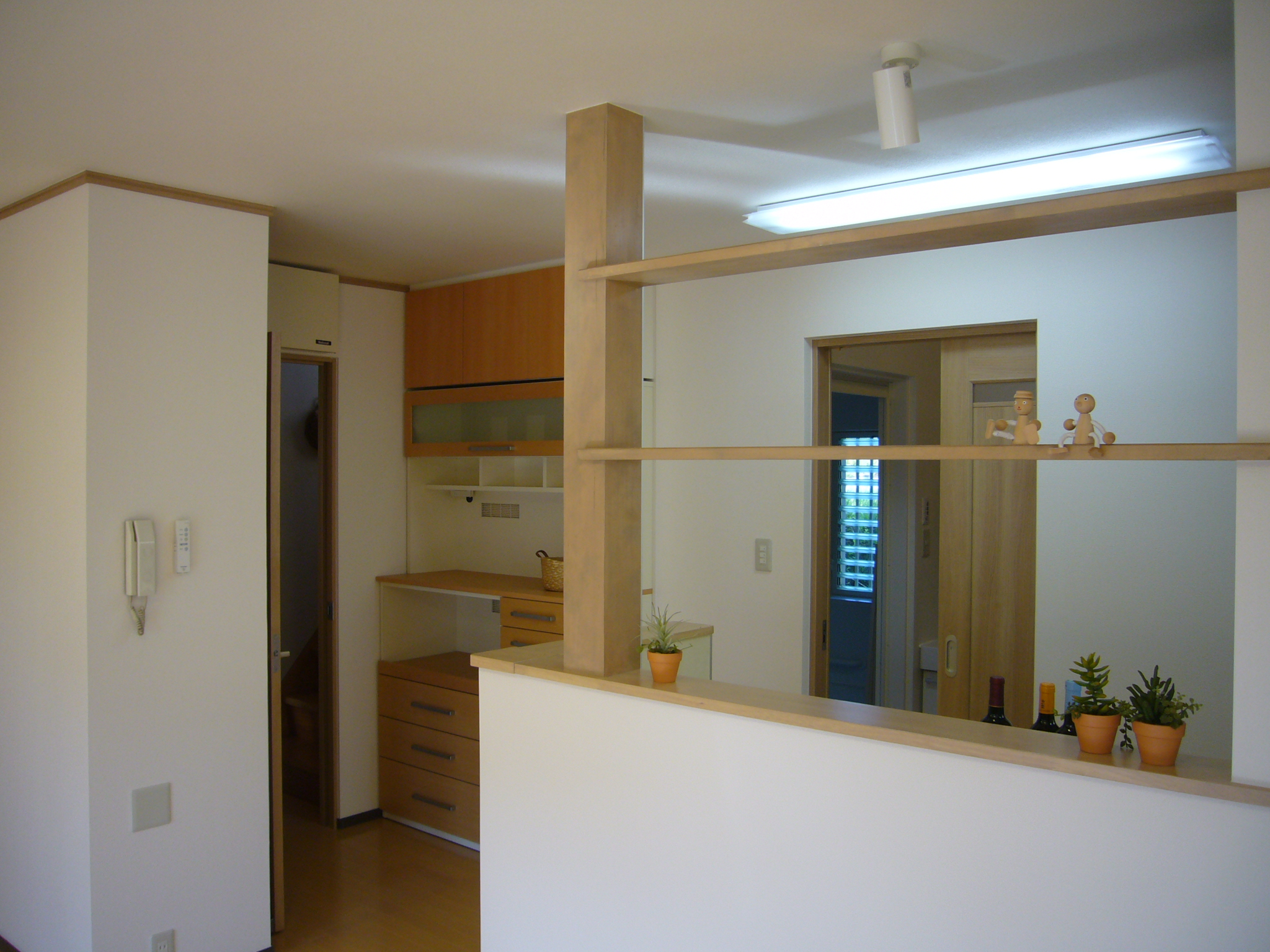 建物構造上、重要な柱が残るので対面キッチンのカウンター前に残り、つなぐような飾り棚を2枚取り付けました。