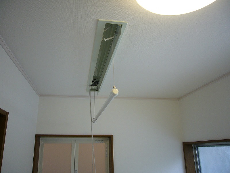 天井には洗濯ものの室内干しの収納竿を設置、昇降できるので使わないときはスッキリします。