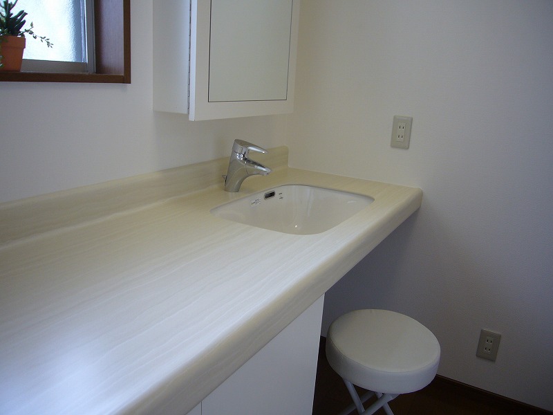 人造大理石タイプの作り付けタイプのカウンターは、ドレッサー的に使えるカウンターを伸ばし、ゆったりと。