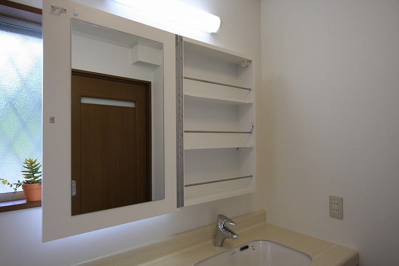 化粧瓶などの小物収納は、扉の両面がミラーになっており、いつでもすぐに身だしなみがととのえられるようにしました。