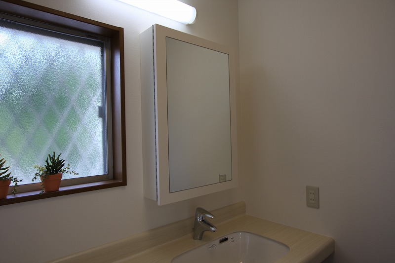 造り付けの人造大理石のカウンター収納や窓に干渉しないミラー収納などにリフォームしました。