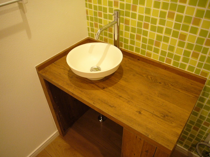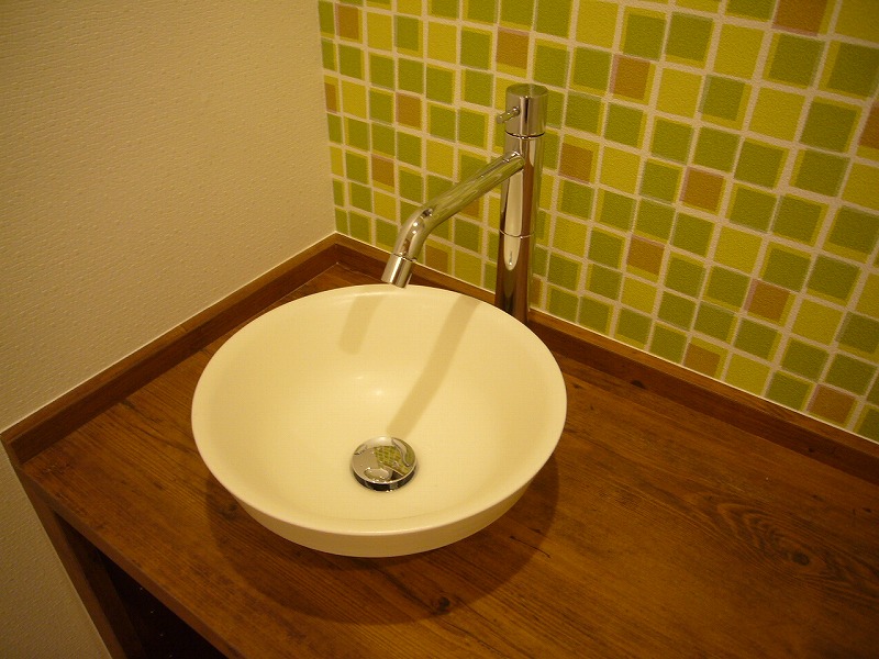 タンクレストイレでスペースを広く使い、陶器ボールの手洗いカウンターを設置。
